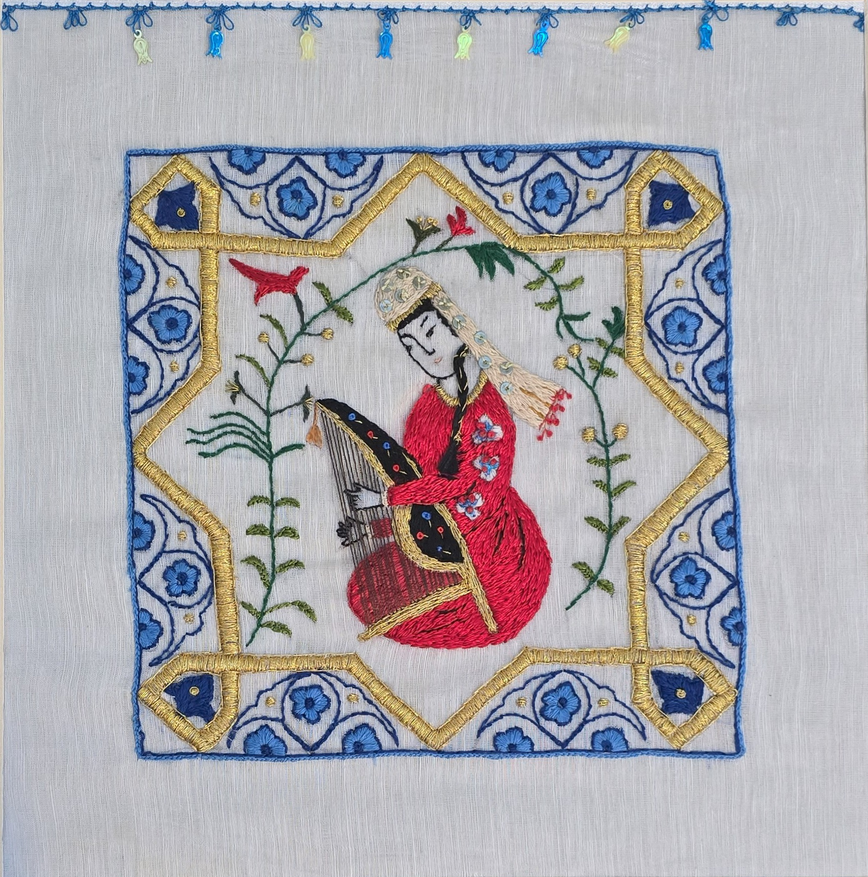 This embroidery is inspired by the figure referred to as Azadeh in Persian mythology and as Çolpan in Turkic mythology, who is identified with the planet Venus. In visual representations, this celestial character almost always appears holding a çeng, an open and angular type of harp.