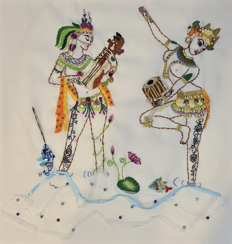 In Hindu mythology, Apsaras are known as nymphs of water and clouds. In this embroidery, they appear alongside traditional Indian instruments - sarangi and tabla. These figures, who are devoted to gods through music and dance, bring the grace and rhythm of divine resonance to fabric.